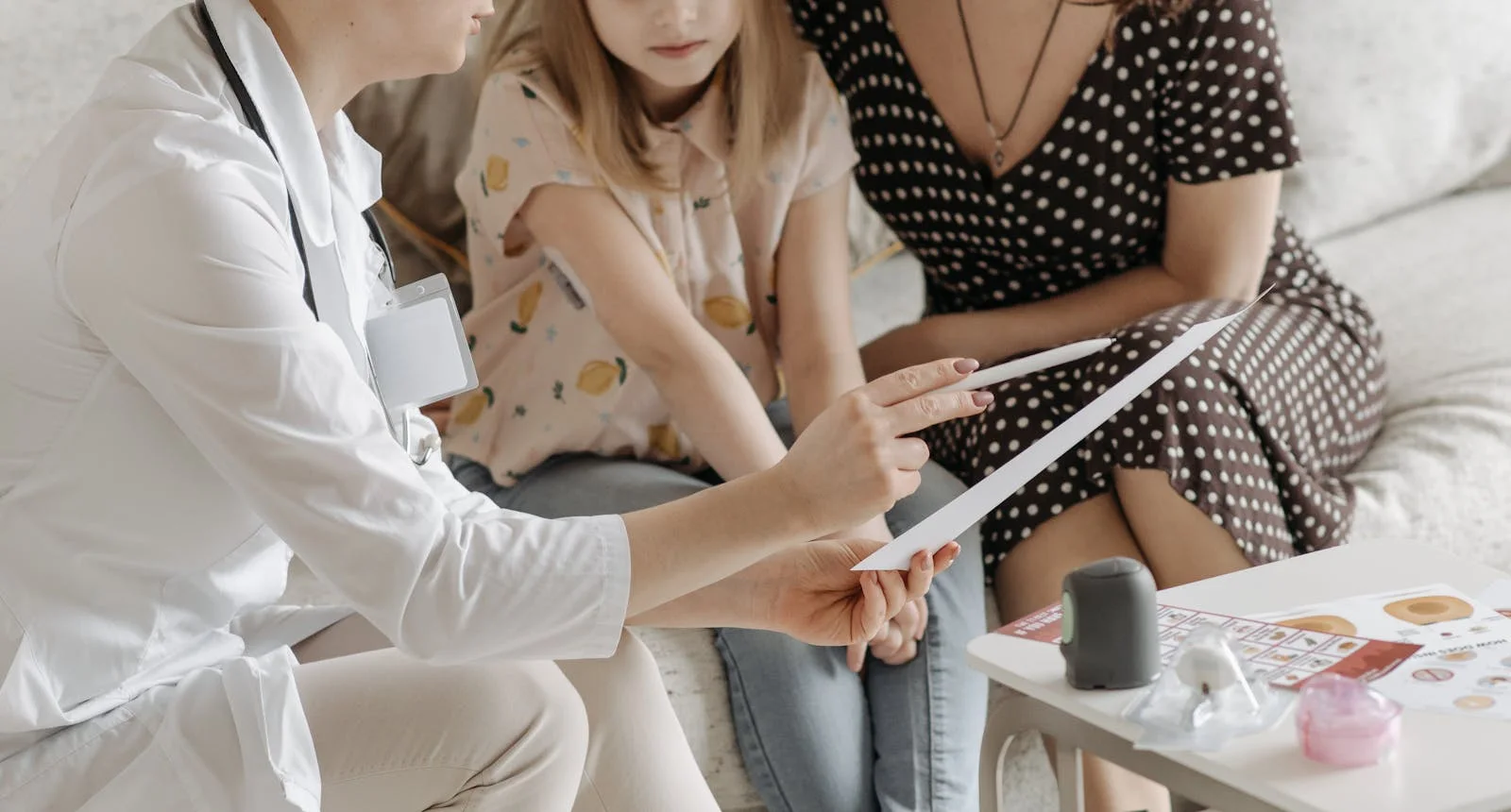 Ärztin im Gespräch mit einer Mutter und ihrem Kind